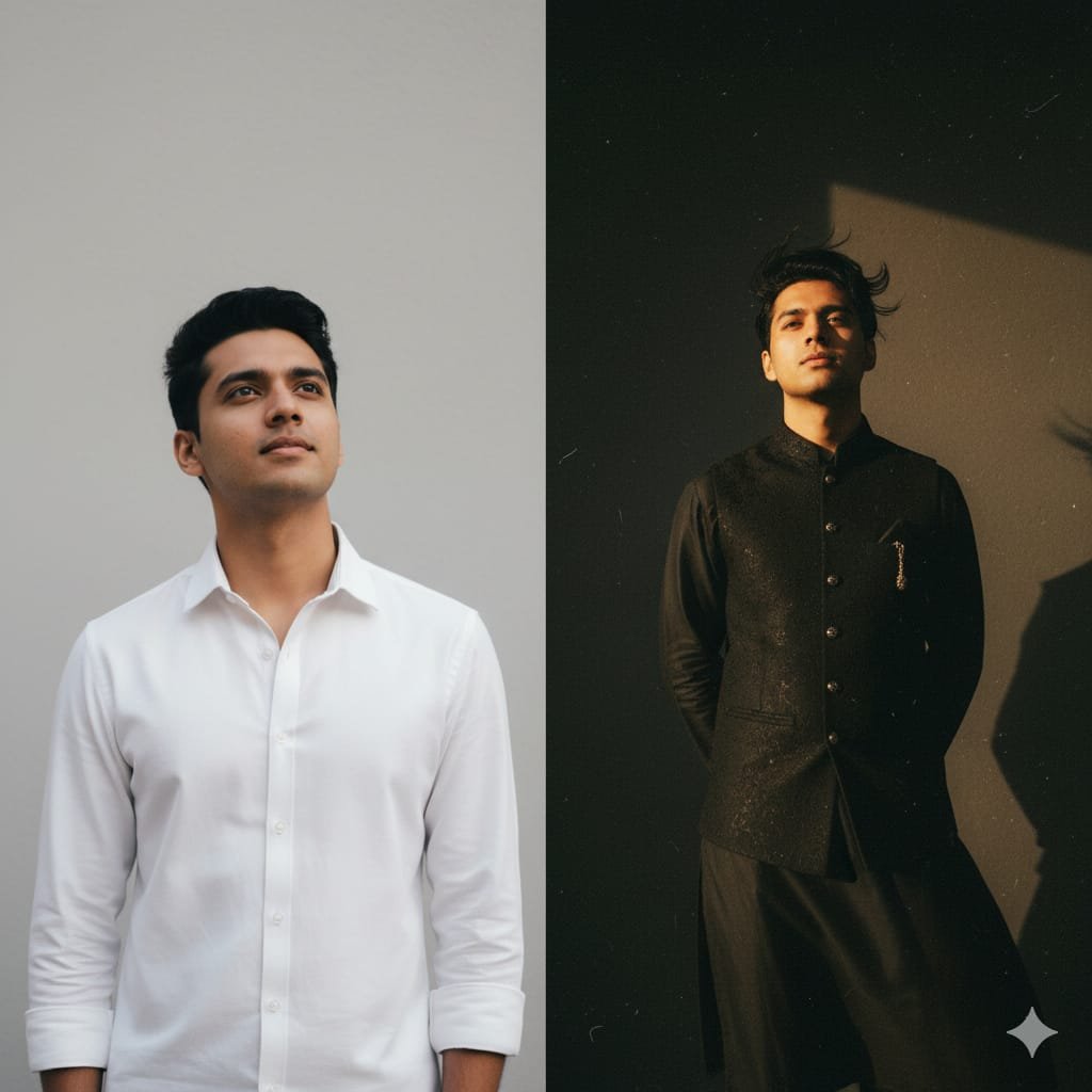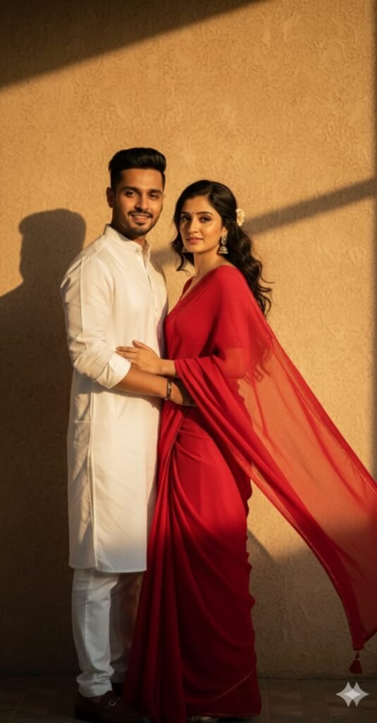 "He will be holding my waist, dressed in a retro style with a white kurta, carrying a Dev Anand-inspired look. I will be in a perfect plain chiffon saree, red in color, giving a Pinteresty aesthetic retro vibe. Think of a 90s movie feel - dark brown wavy curly hair with a small flower tucked visibly into the curls, romanticizing in a windy environment. I'll be standing against a solid wall with deep shadows and contrast drama, creating a mysterious and artistic atmosphere. The lighting will be warm with golden tones, evoking a sunset or golden hour glow. The background will stay minimalistic and slightly textured, while my expression will be moody, calm, yet happy and introspective."