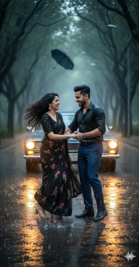 "Create a highly realistic cinematic image of a man and woman dancing cutely in the rain on a tree lined road. Use their real face 699 features clearly visible -show both the women's face and man's face naturally. The women is wearing a bright black saree with delicate flower prints, curly weight hairs, jhumkas, and heels, the man is wearing a classic black shirt with blue tuxedo style pants. Both are smiling joyfully while dancing show them un different cute dance poses- sometimes spinning, sometimes laughing while holiding hands, sometimes stepping in puddles.Keep the vibe playful and innocent, not sensual. A car is parked nearby while yellow headlights glowing softly in the rain. Their umbrella is flying away in the wind, adding to the fun. The wet road should reflect the rain and headlights for a cinematic, dreamy effect."