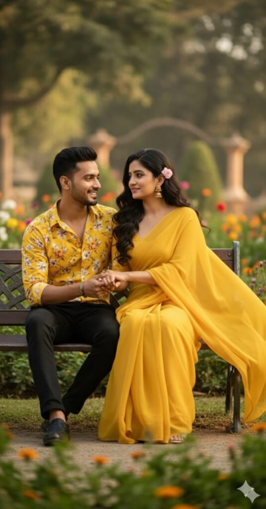 "He will be holding my hand in his hand, dressed in a retro style with a floral yellow shirt, carrying a Dev Anand-inspired look. I will be in a perfect plain chiffon saree, yellow in color, giving a Pinteresty aesthetic retro vibe. Think of a 90s movie feel - dark brown wavy curly hair with a small flower tucked visibly into the curls, romanticizing in a windy environment. We'll be sitting on a beautiful bench in a beautiful garden and contrast drama, creating a mysterious and artistic atmosphere. The lighting will be warm with golden tones, evoking a sunset or golden hour glow. The background will stay minimalistic and slightly textured, while my expression will be moody, calm, yet happy and introspective."