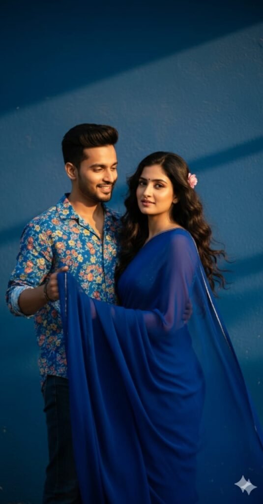 "He will be holding my saree pallu in his hand, dressed in a retro style with a floral blue shirt, carrying a Dev Anand-inspired look. I will be in a perfect plain chiffon saree, blue in color, giving a Pinteresty aesthetic retro vibe. Think of a 90s movie feel - dark brown wavy curly hair with a small flower tucked visibly into the curls, romanticizing in a windy environment. I'll be standing against a solid wall with deep shadows and contrast drama, creating a mysterious and artistic atmosphere. The lighting will be warm with golden tones, evoking a sunset or golden hour glow. The background will stay minimalistic and slightly textured, while my expression will be moody, calm, yet happy and introspective."